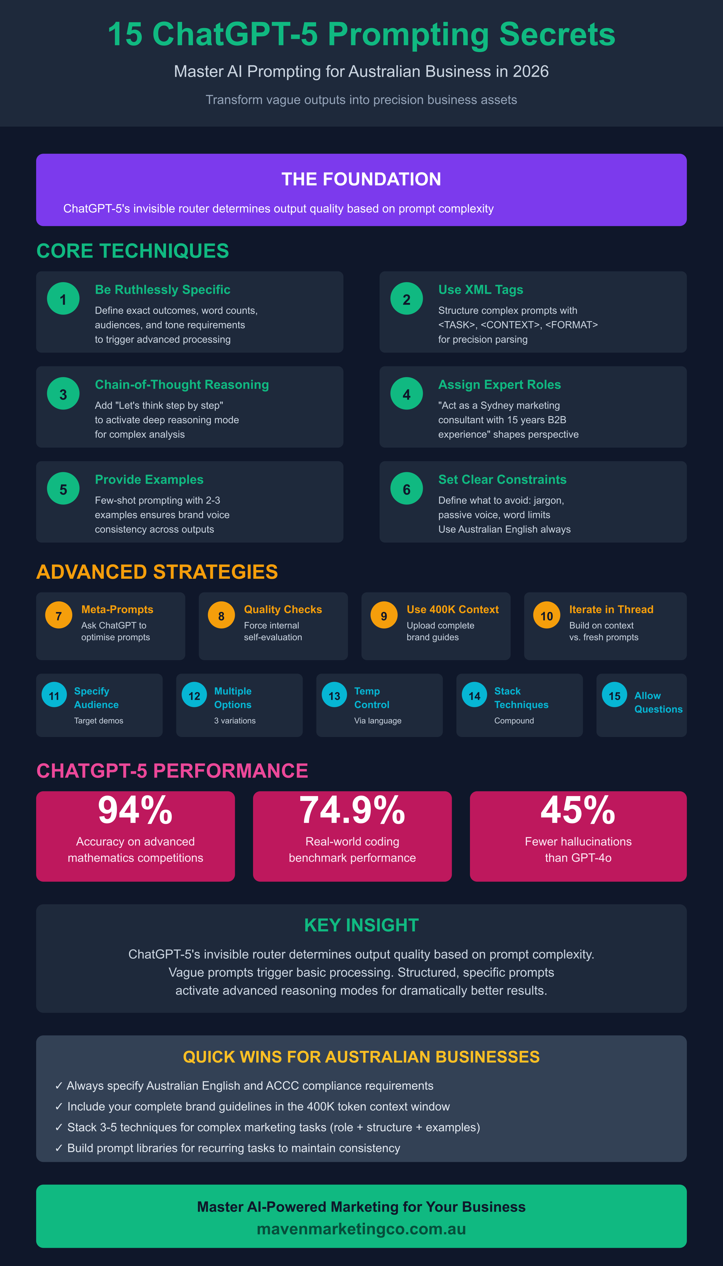 Since its August 2025 launch, ChatGPT-5 has delivered unprecedented performance across mathematics, coding, and reasoning tasks. The model achieved over 94% accuracy on advanced mathematics competitions and 74.9% on real-world coding benchmarks. Yet most Australian businesses are not seeing these results because they have not adapted their prompting strategies to match the model's new architecture.