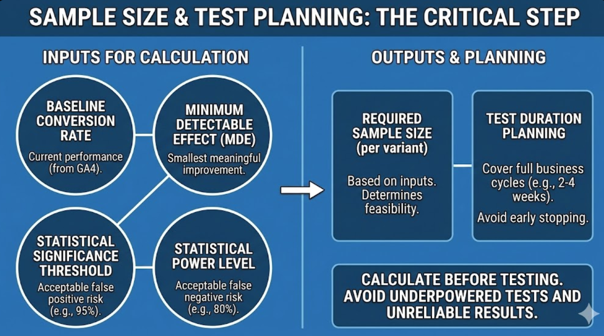 - Proper sample size calculation before testing begins determines how long tests must run to detect meaningful performance differences reliably—skipping this calculation produces underpowered tests that miss real improvements or declare random variation as significant results