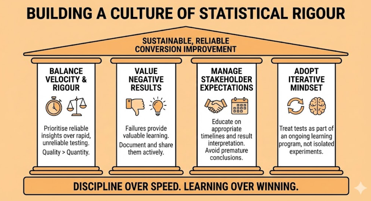 Velocity versus rigour balance addresses the tension between testing speed and statistical reliability. High-velocity testing—rapid iterations without statistical controls—generates activity that feels productive whilst producing unreliable results. Slow, rigorous testing produces fewer but more reliable insights. Optimal testing cultures prioritise reliability over velocity, accepting that properly designed tests take longer to complete but produce genuine improvements that accumulate into significant performance gains, whilst fast-but-flawed testing programmes generate noise that occasionally improves performance through luck rather than systematic optimisation.