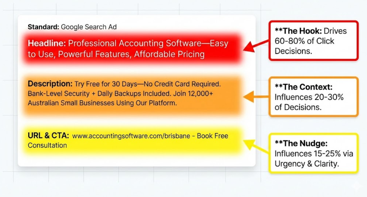 Your competitor's ad for identical keyword achieves 6.8% CTR at $4.20 CPC: "See Why 47,000 Brisbane Businesses Trust Our Accounting Software—Free 30-Day Trial." Their messaging isn't accidentally better—it's systematically tested, refined, and optimized through frameworks identifying what actually motivates clicks and conversions.