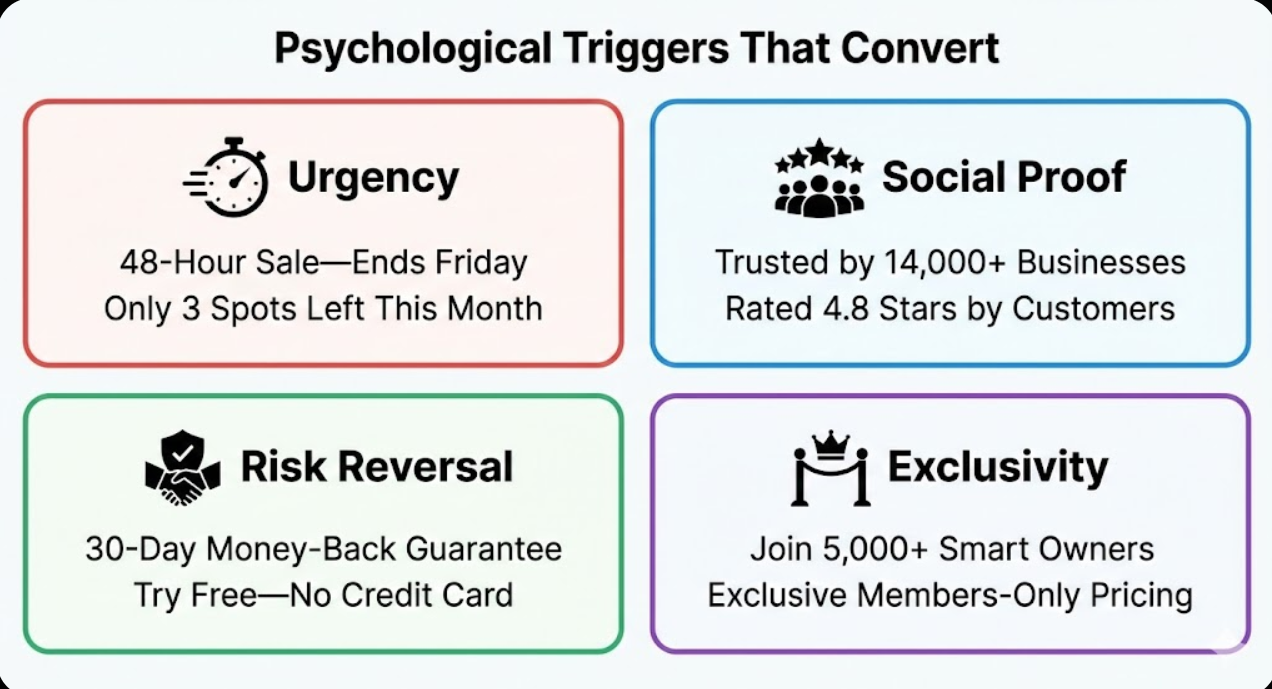 Psychological trigger frameworks provide proven copywriting approaches worth testing systematically: