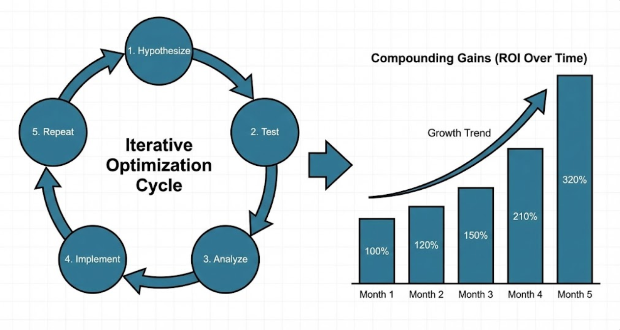 - Systematic testing frameworks compound improvements with 15-20% monthly performance gains accumulating to 300-500% annual improvements through iterative optimization cycle testing one variable at time