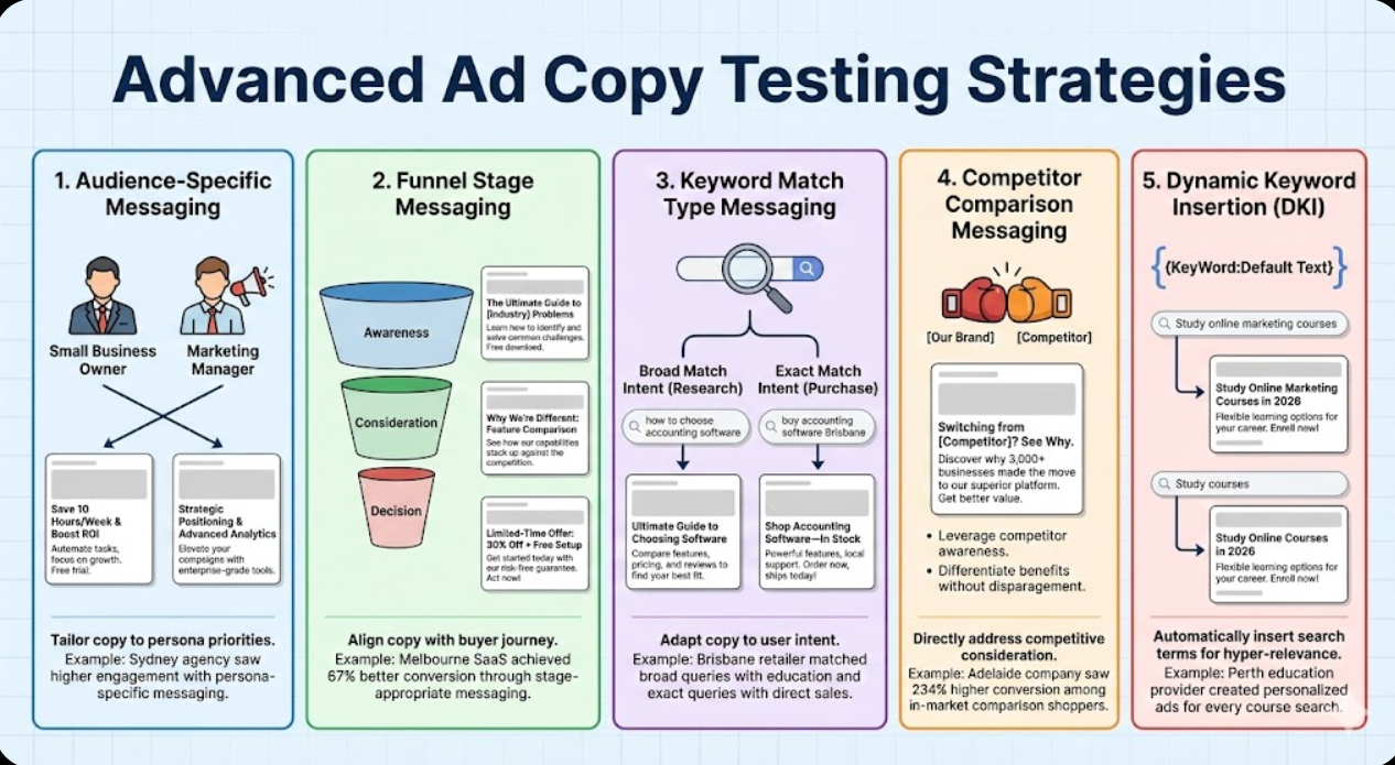 Sophisticated testing approaches extend beyond basic headline/description testing to strategic messaging optimization.