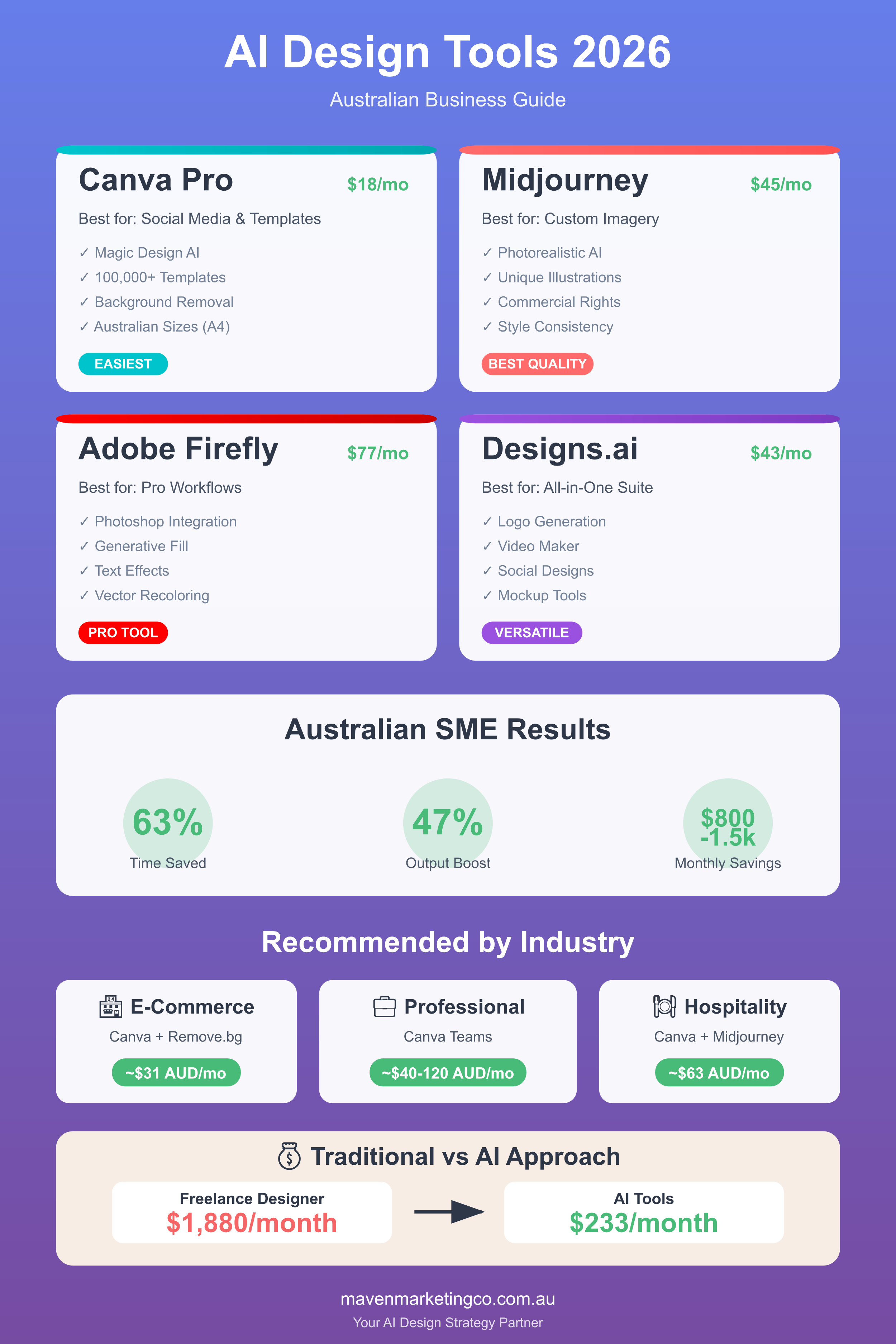 The transformation is measurable: Australian businesses using AI design tools report 63% reduction in content creation time, 47% increase in visual content output, and average savings of $800-1,500 monthly compared to freelancer costs.