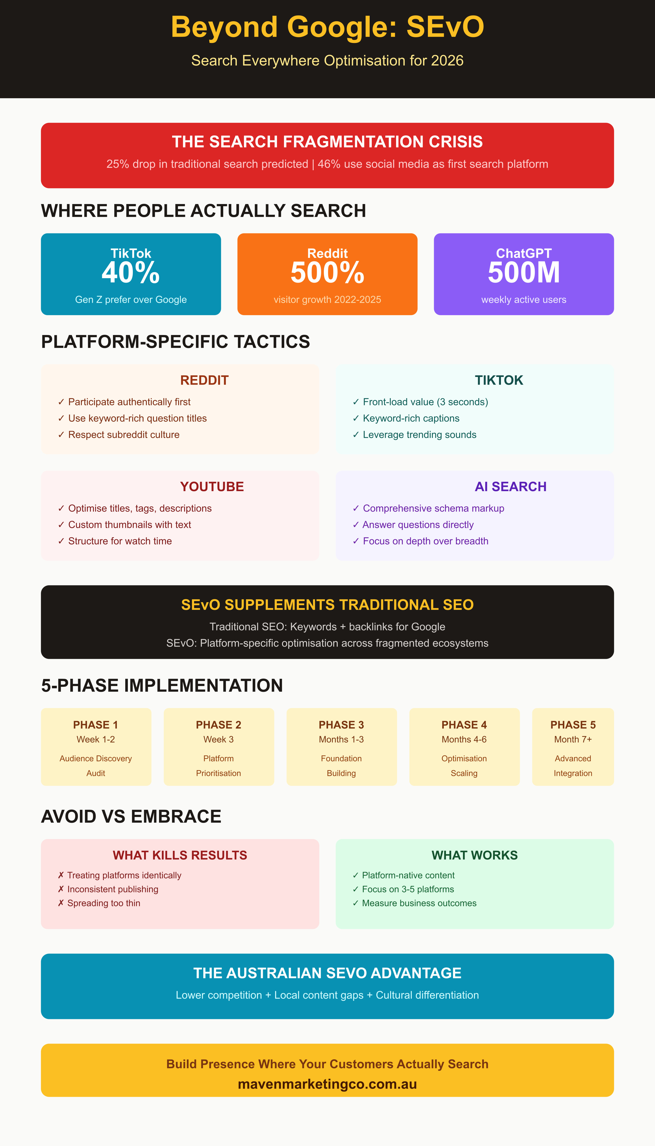 For Australian businesses, this demands strategic focus. You cannot optimise equally for every platform simultaneously. Successful SEvO starts with identifying where your specific audience actually searches, then systematically building presence and optimisation across those priority platforms.