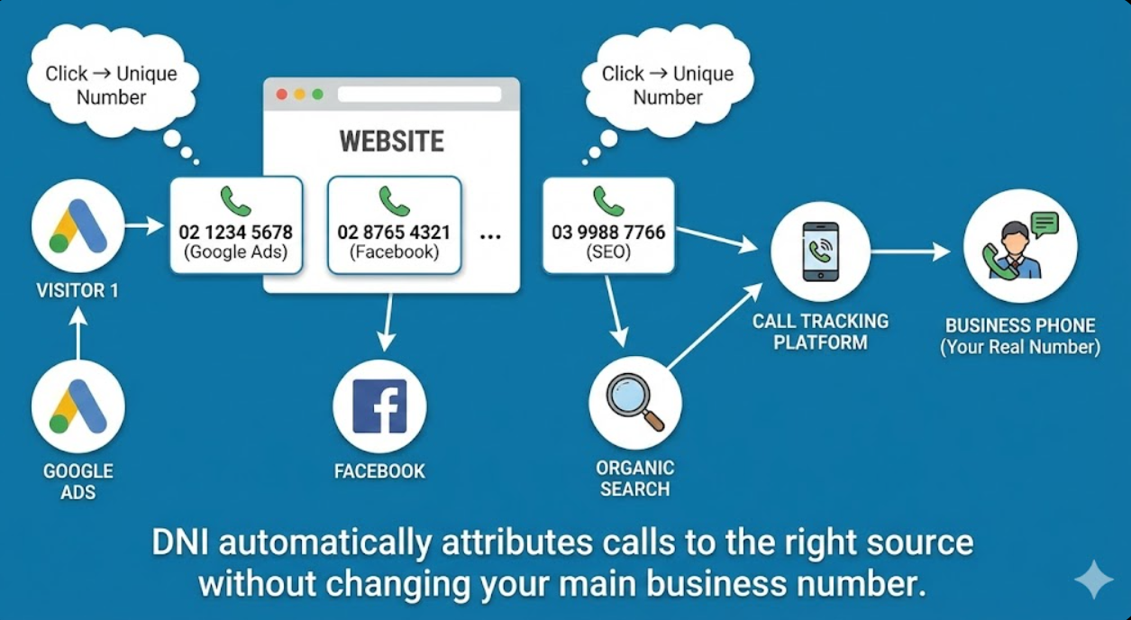 Dynamic Number Insertion (DNI) represents the foundational technology enabling accurate per-visitor call attribution without requiring different published phone numbers for different channels. DNI works by placing a small JavaScript snippet on your website that detects the traffic source of each visitor—identifying whether they arrived from Google Ads, organic search, Facebook, direct navigation, or any other source—and dynamically replaces the displayed phone number with a unique tracking number associated with that traffic source. When the visitor calls the displayed tracking number, the call tracking platform records the attribution data before connecting the call to your actual business number. The caller hears your business answer normally; you receive complete attribution data automatically. DNI enables channel-level attribution without requiring visitors to consciously remember or dial source-specific numbers.