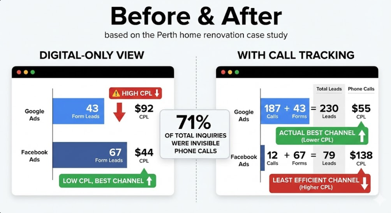 A Perth home renovation business spent $12,000 monthly across Google Ads, Facebook Ads, and local SEO. Digital analytics showed Google Ads generating forty-three website form submissions monthly at $92 cost per lead. Facebook Ads generated sixty-seven form submissions at $44 cost per lead. Based on these figures, the business owner planned to increase Facebook investment whilst reducing Google Ads—Facebook appeared to outperform Google by almost exactly half the cost per lead.