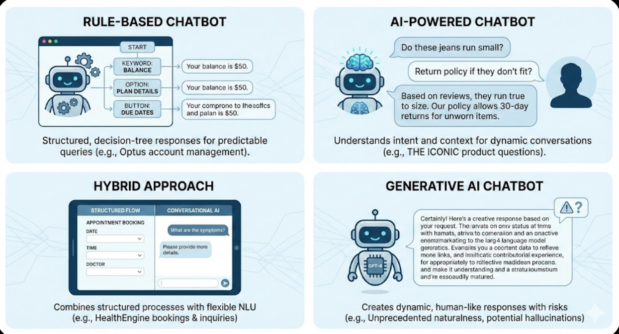 Melbourne telecommunications provider Optus implemented rule-based chatbot for basic account management including balance inquiries, plan details, and payment due dates. The structured approach works well for these transactional queries where customers simply want specific information without conversational complexity. However, Optus preserves human support for billing disputes, technical troubleshooting, and retention discussions requiring nuanced understanding.