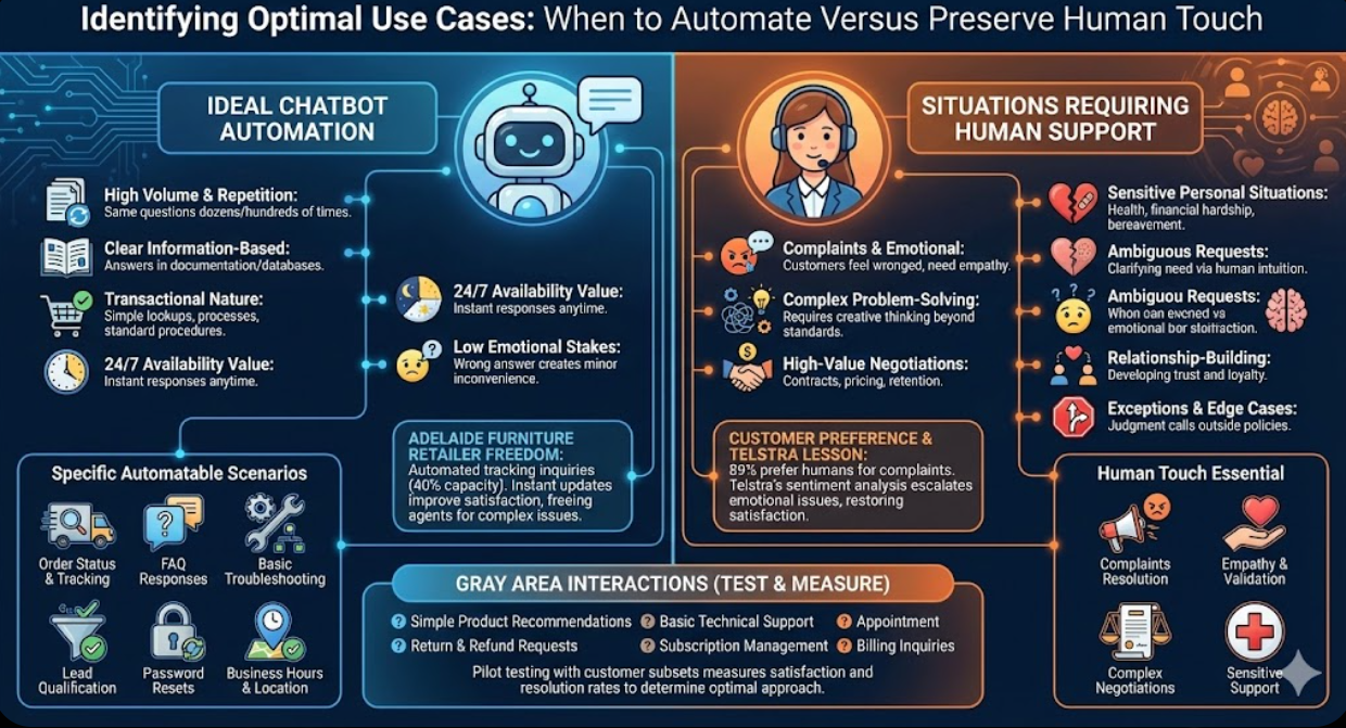 Strategic chatbot deployment focuses automation on interactions where it genuinely enhances customer experience whilst preserving human support for situations requiring empathy and complex judgment.