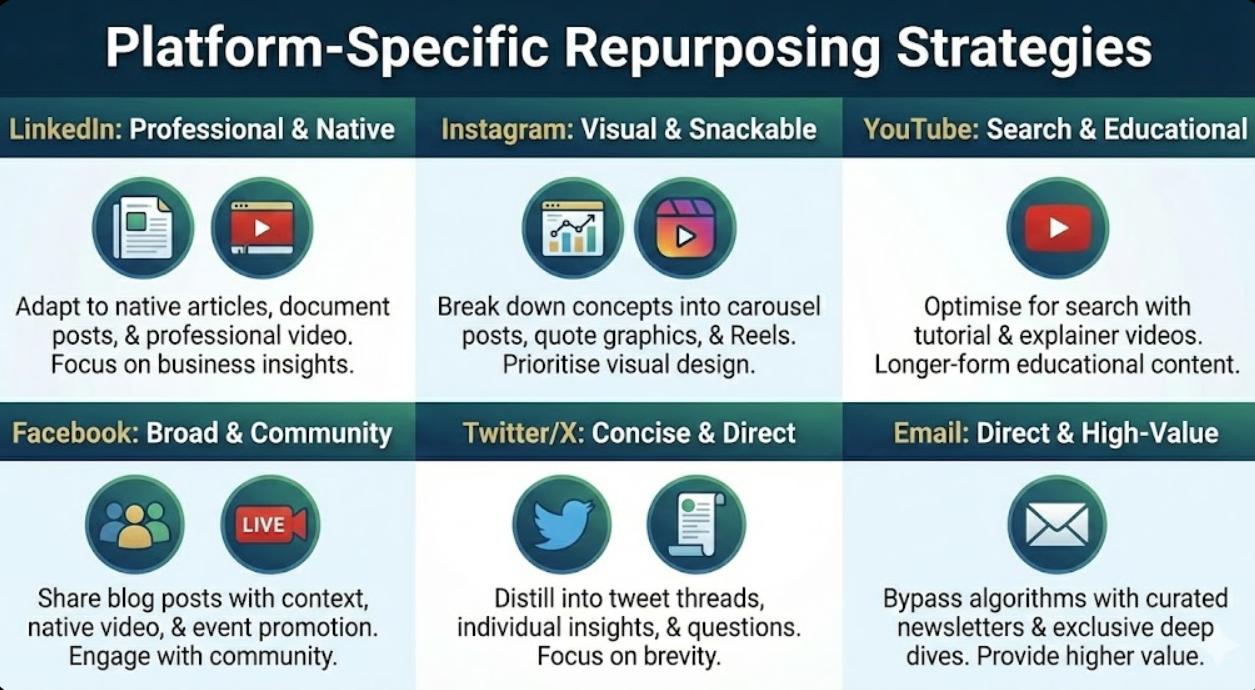 - Platform-specific optimisation adapts repurposed content to each channel's unique requirements—LinkedIn professional tone, Instagram visual focus, YouTube search optimisation, and podcast conversational delivery