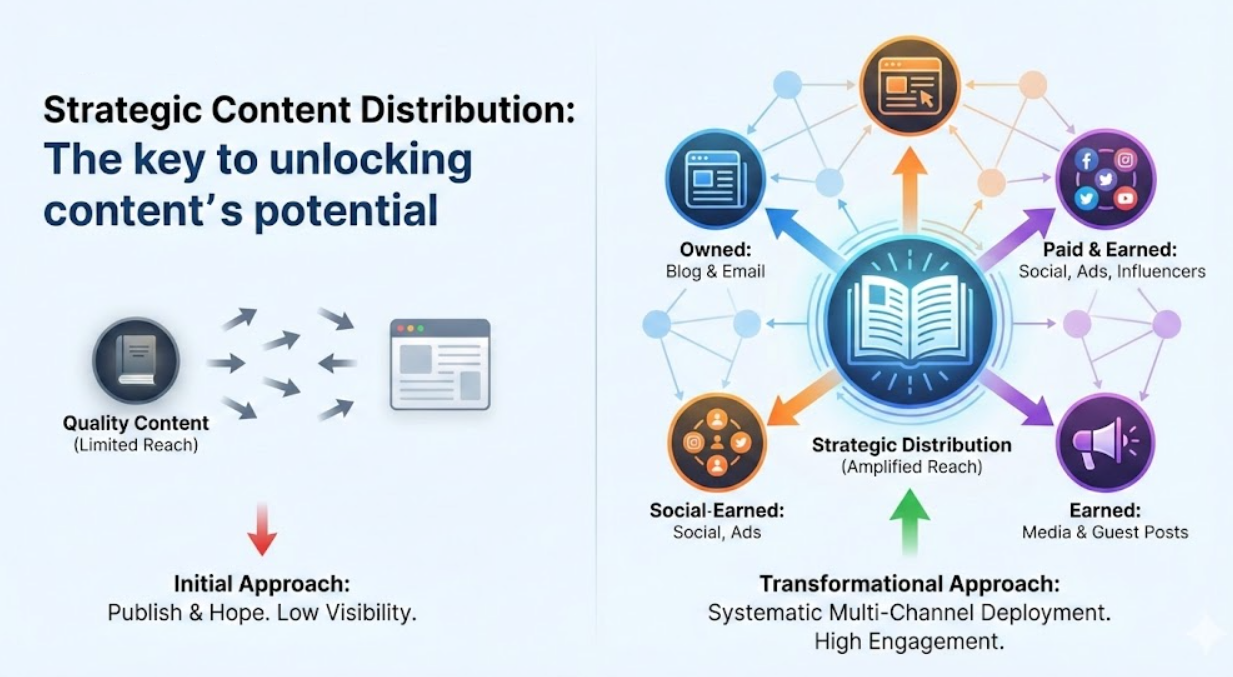They implemented systematic repurposing strategy. Each monthly blog post became a LinkedIn article series (5-6 weekly posts), an email sequence (3-part nurture series), short-form video scripts (3 x 60-second explainers), an infographic summarising key statistics, and Instagram carousel posts breaking down main concepts visually.