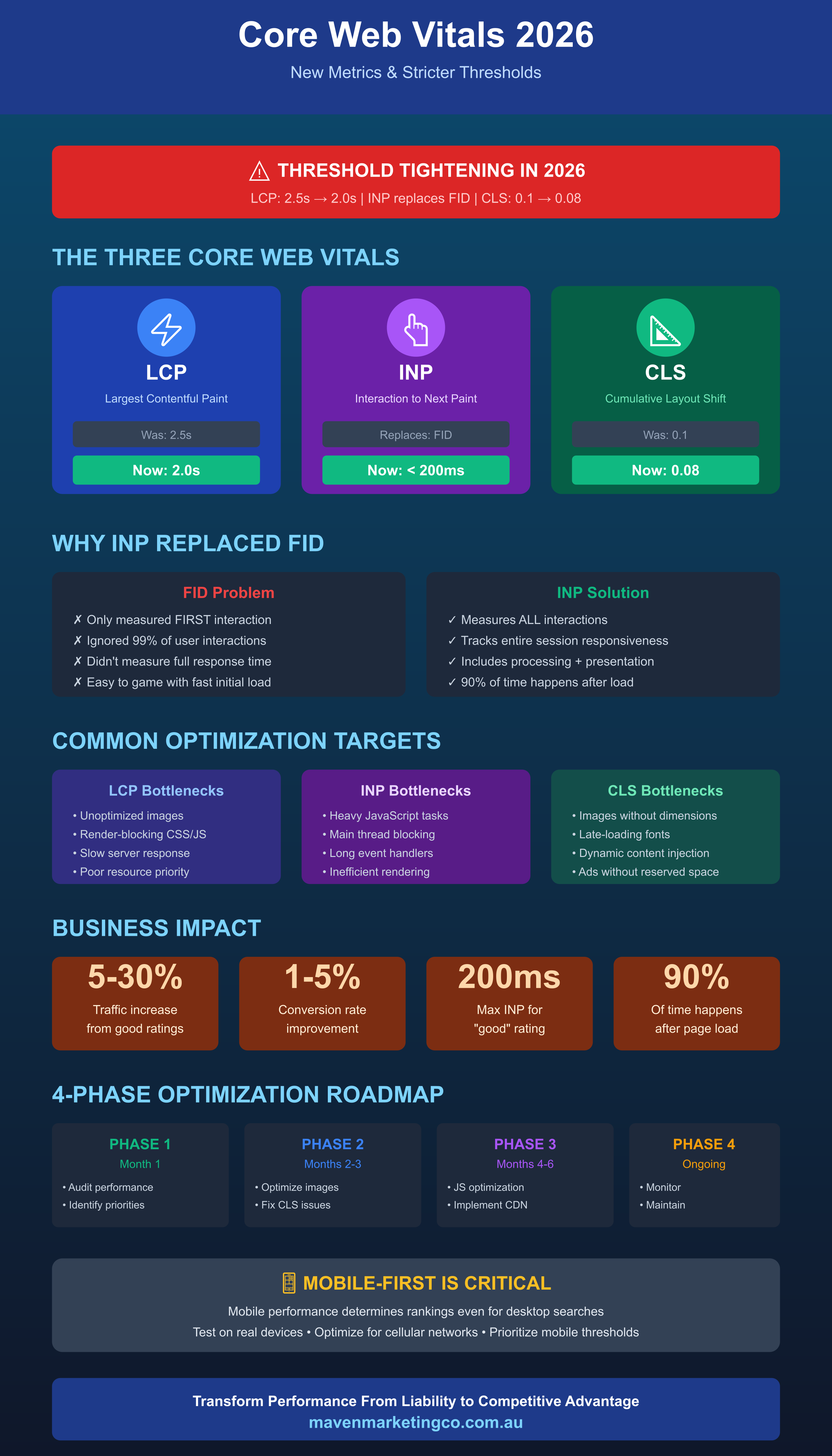 Largest Contentful Paint thresholds tightened significantly for 2026, with good performance now requiring LCP under 2.0 seconds compared to the previous 2.5 second standard. This half-second reduction creates substantial challenges for Australian businesses, particularly those serving mobile users over cellular networks.