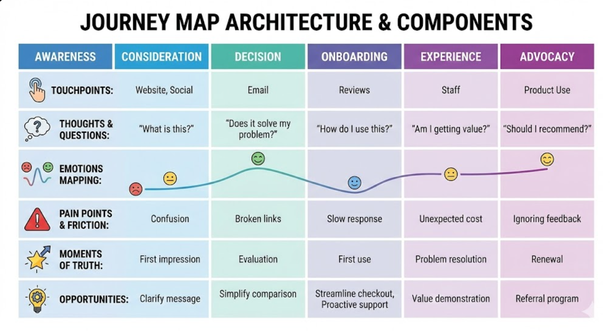 - Effective journey maps are research-driven rather than assumption-based, incorporating actual customer interviews, behavioural analytics, session recordings, and survey data that reveal genuine customer experience rather than internal assumptions about what customers encounter
