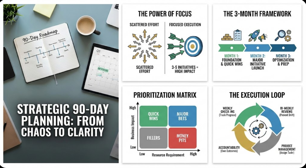 Strategic planning doesn't require MBA-level complexity. Effective 90-day roadmaps answer four questions: What are we trying to achieve? What specific actions will get us there? Who's responsible? How will we measure success?