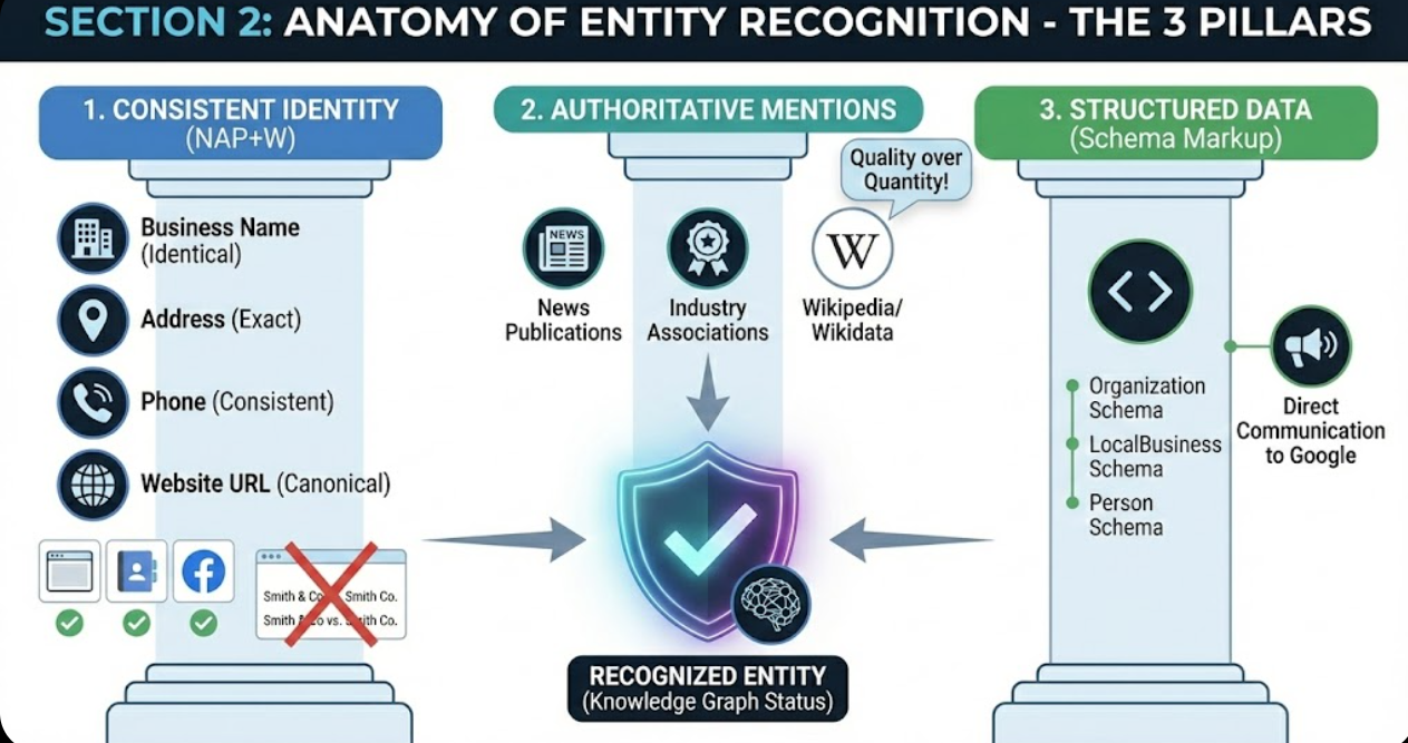 Google determines entity status through multiple interconnected signals. Understanding these signals allows you to systematically build recognition.