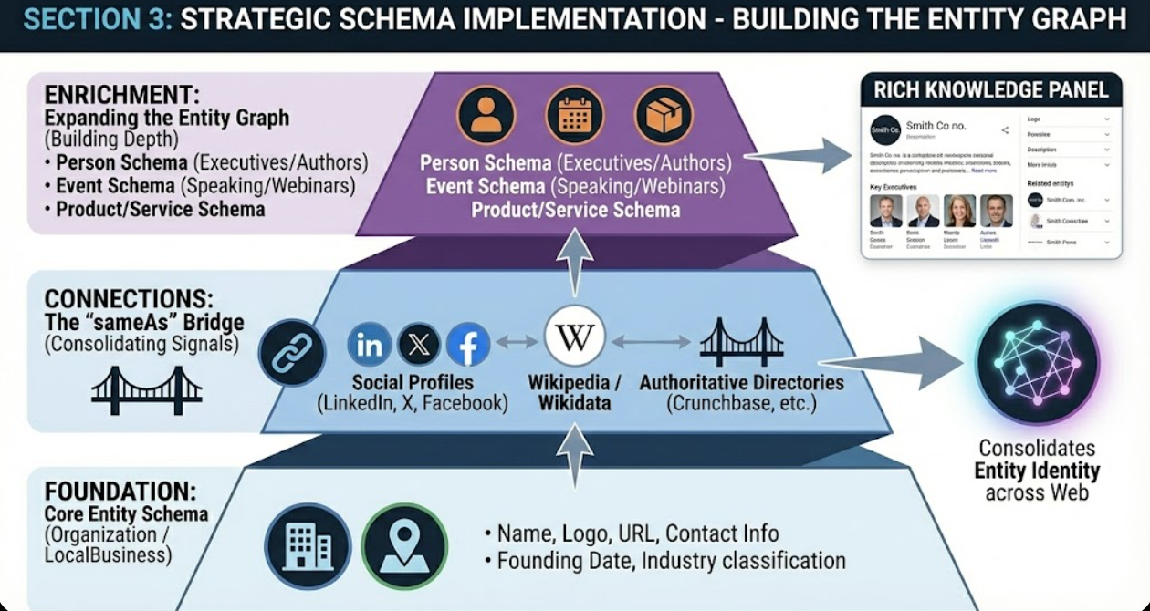 The strategic sequence matters. Start with properties you control (your website, social profiles), then expand to third-party platforms (directories, review sites), and ultimately aim for presence on knowledge bases (Wikipedia, Wikidata). Each layer reinforces the previous one.