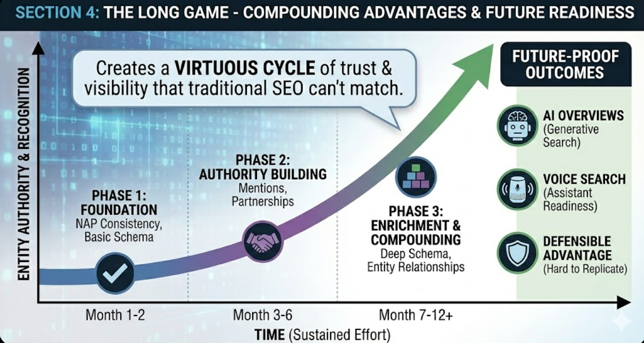 - Building entity authority takes 6-12 months of sustained effort but creates compounding advantages that traditional keyword SEO cannot replicate