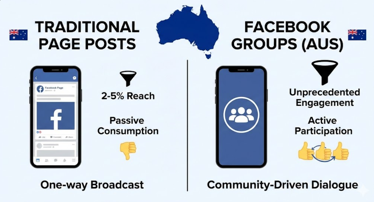 Here's the uncomfortable truth: your Facebook Page posts are reaching roughly 2-5% of your followers organically. Meanwhile, Facebook Groups are experiencing unprecedented engagement, with members actively seeking out community discussions and brand interactions. This isn't just a temporary trend; it's a fundamental shift in how Australians consume and engage with content online.