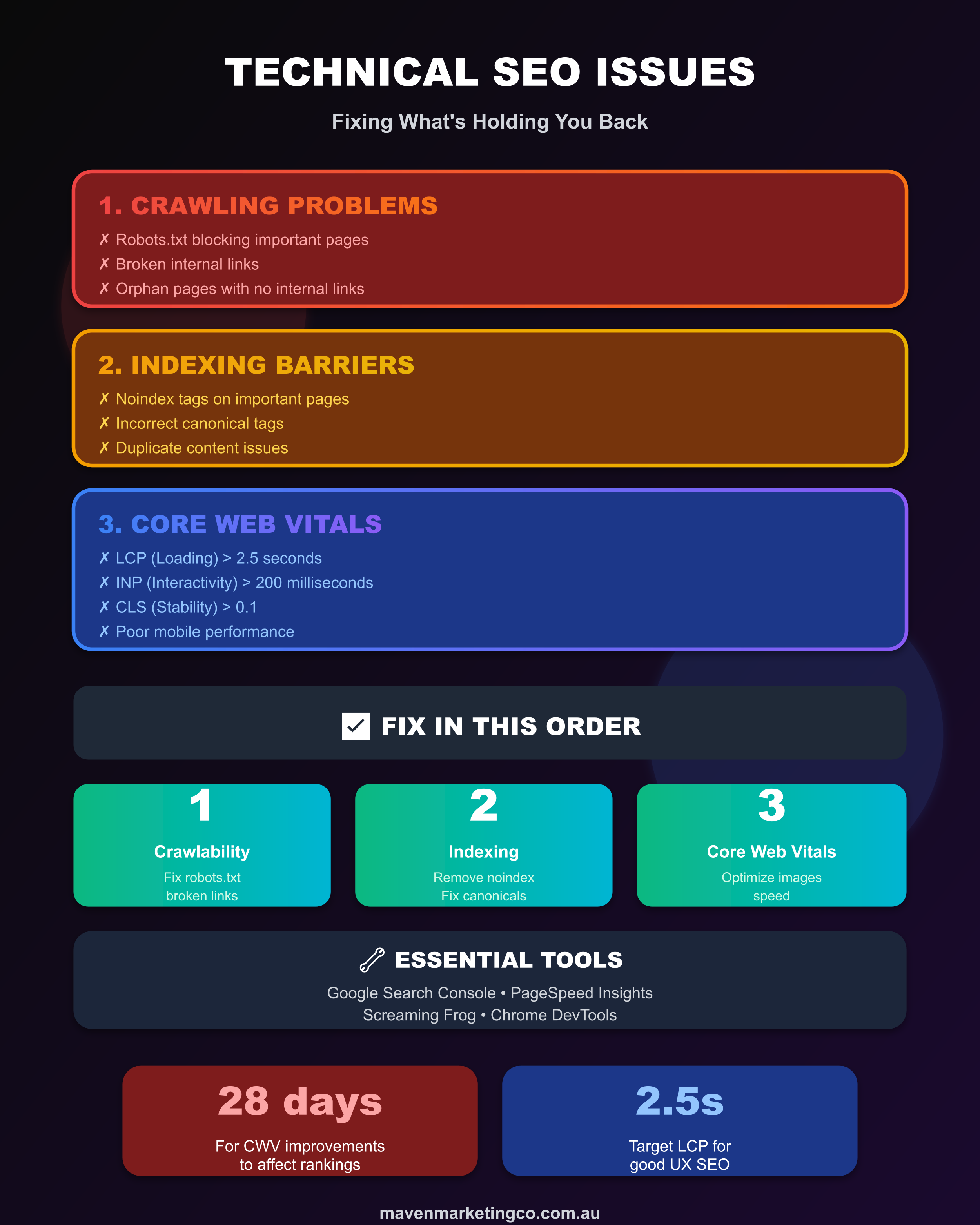 Resource constraints at many Australian SMEs make prioritising technical fixes critical. You likely cannot address everything simultaneously, and that's fine. Focus first on issues affecting your most valuable pages, those driving the most traffic or conversions. Address critical crawlability problems before optimising Core Web Vitals. Ensure indexing works properly before refining page experience signals.