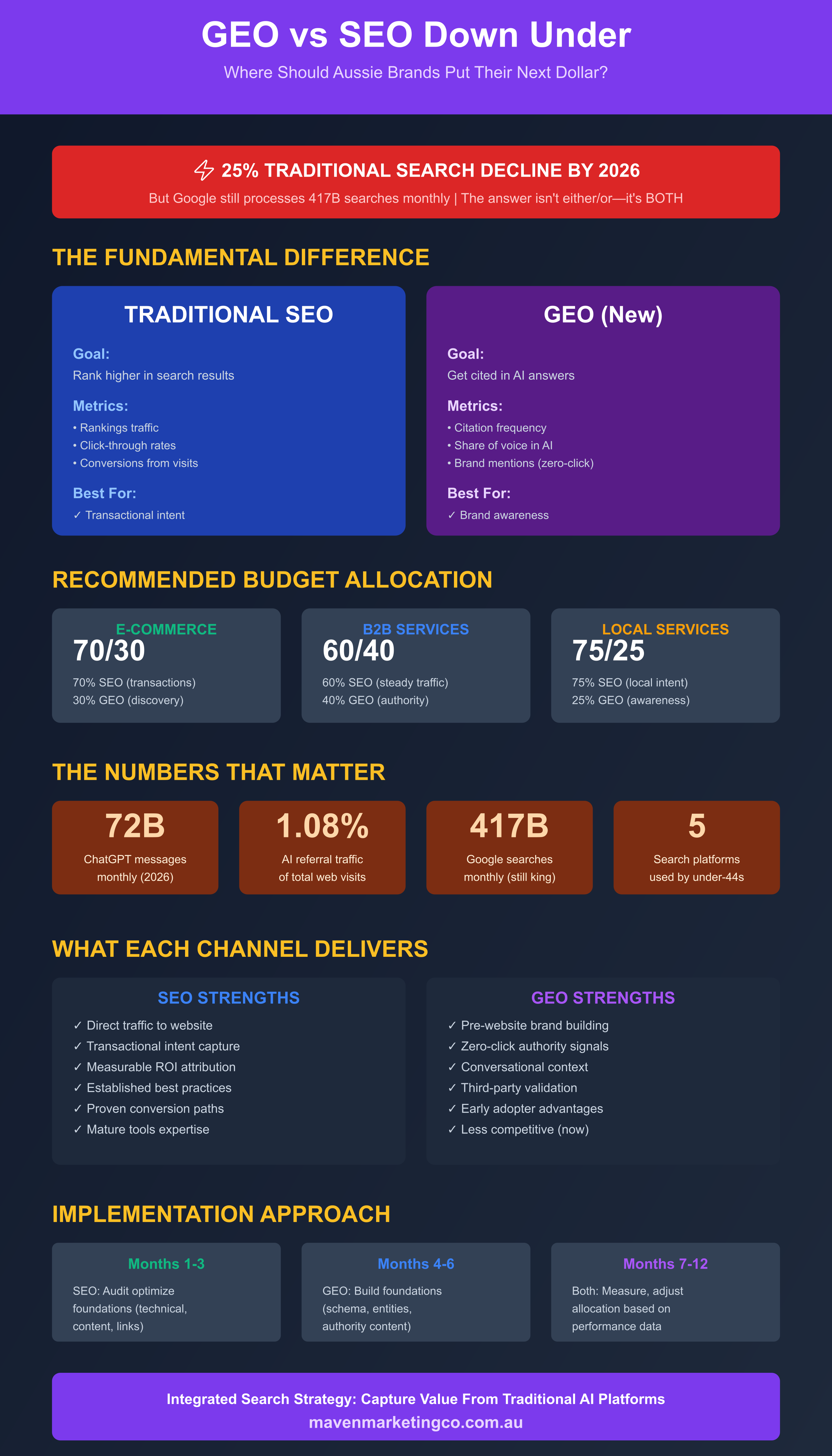 For most Australian businesses in 2026, the pragmatic answer is 60-70% SEO maintenance combined with 30-40% GEO experimentation, adjusting quarterly based on measured performance rather than industry hype.
