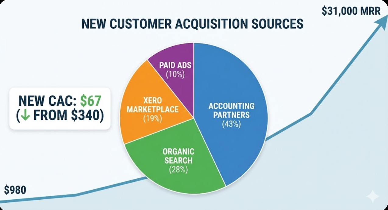 Twelve months later, customer acquisition cost had dropped to $67. Monthly recurring revenue reached $31,000. Accounting firm partnerships contributed 43% of new customers. Organic search generated 28%. Xero marketplace 19%. Paid advertising—previously the primary channel—now represented 10% of acquisition through more targeted deployment. Growth marketing transformed economics from business-model-destroying to genuinely scalable through channel diversification and unit economics discipline.