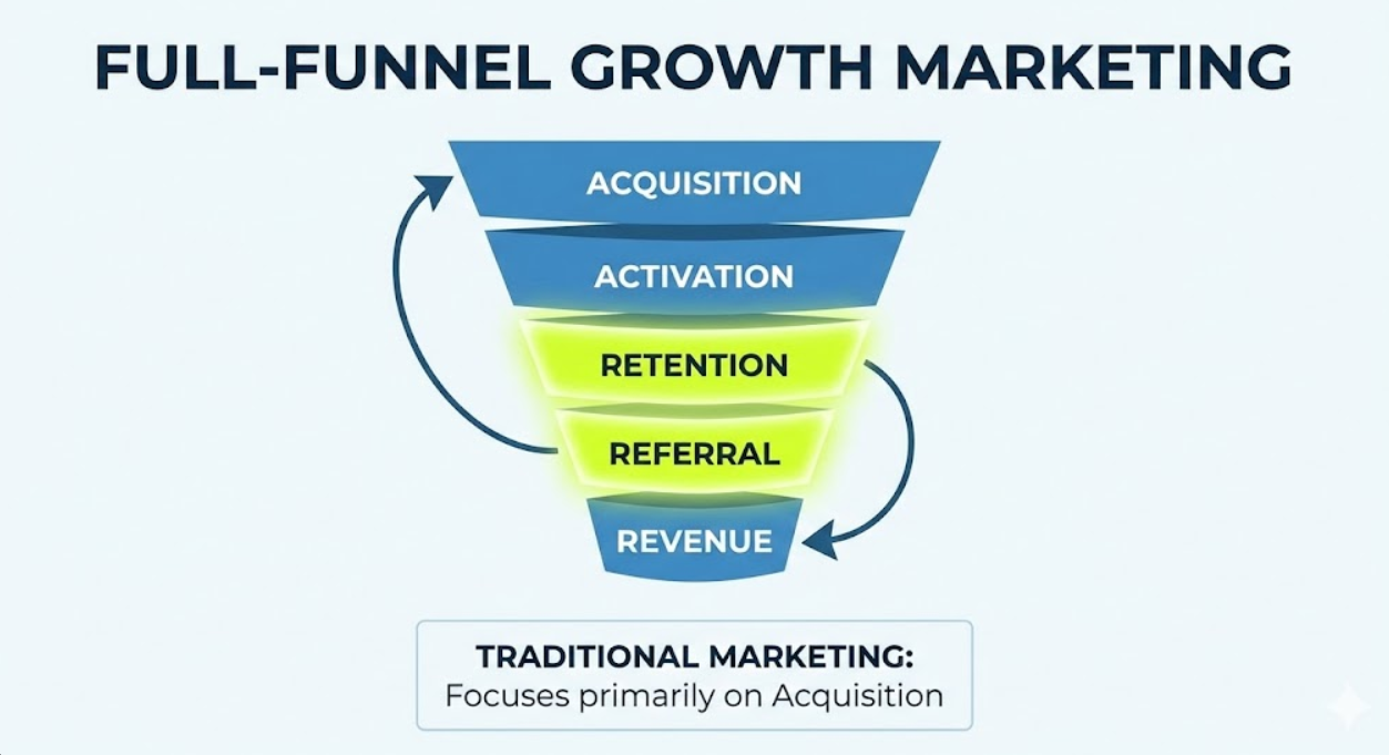 Full-funnel responsibility extends growth marketing beyond acquisition into retention, monetisation, and referral stages that traditional marketing often treats as separate functional responsibilities. Traditional marketing optimises for new customer acquisition, passing responsibility to sales, product, and customer success teams for everything that follows. Growth marketing recognises that leaky retention funnels destroy acquisition investment value—acquiring customers who immediately churn generates impressive new customer metrics whilst destroying unit economics. Full-funnel ownership ensures growth marketing optimises the complete customer value journey rather than just the acquisition entry point.