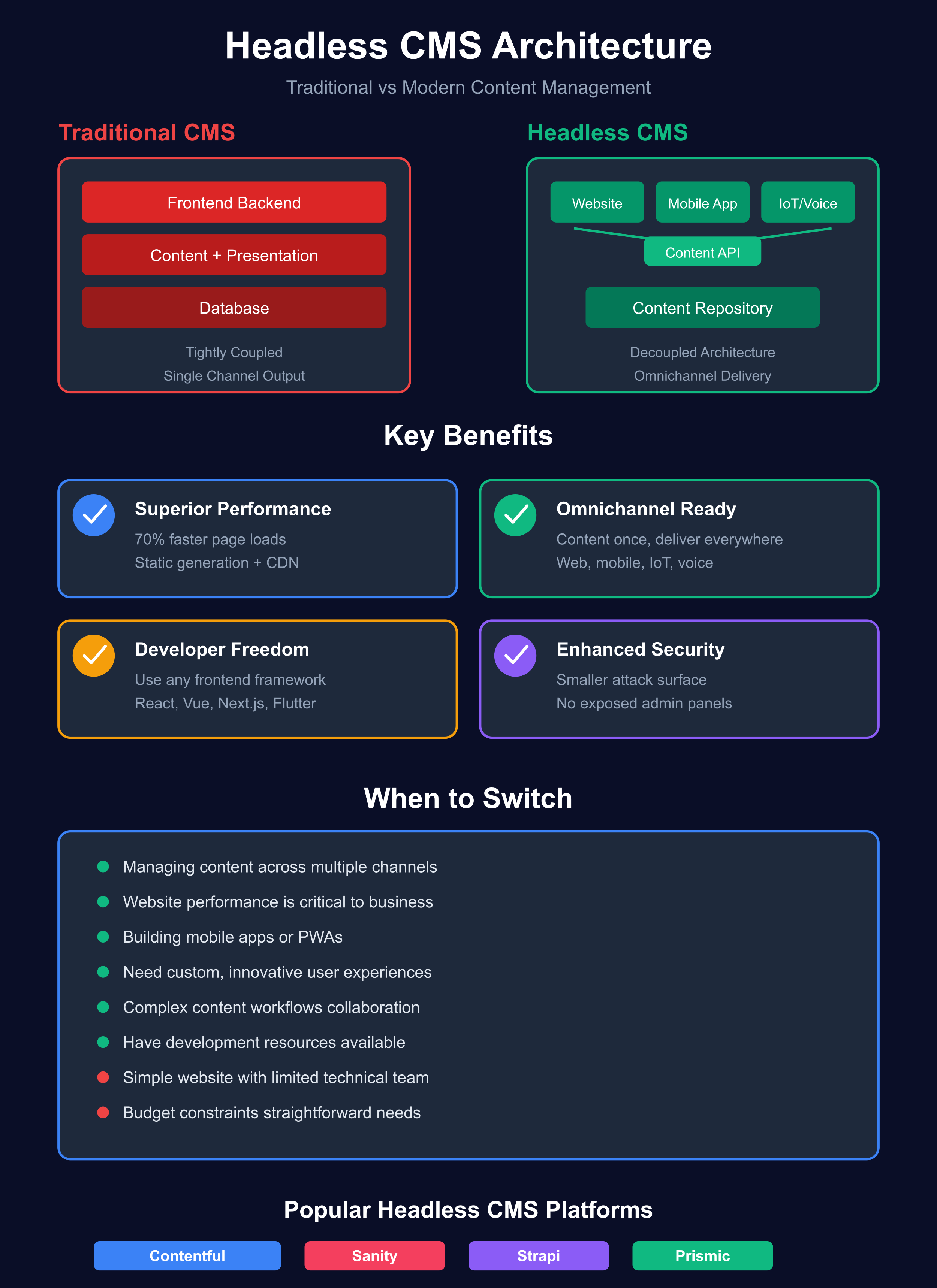 Switching to headless CMS architecture is a significant decision that requires careful evaluation of your business needs, technical capabilities, and growth strategy. Not every business needs headless CMS today, but understanding when it makes sense ensures you're not left behind as digital expectations evolve.