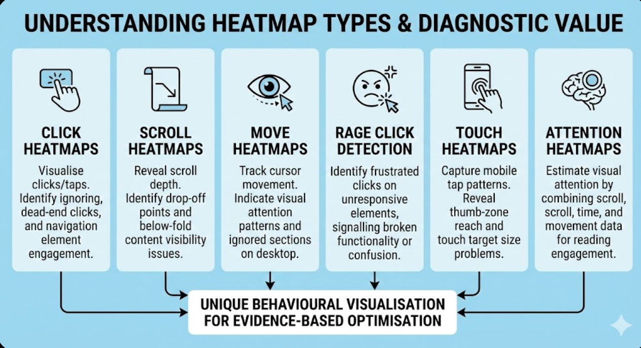 Different heatmap formats reveal distinct aspects of user behaviour, with each type answering specific questions that others cannot address.