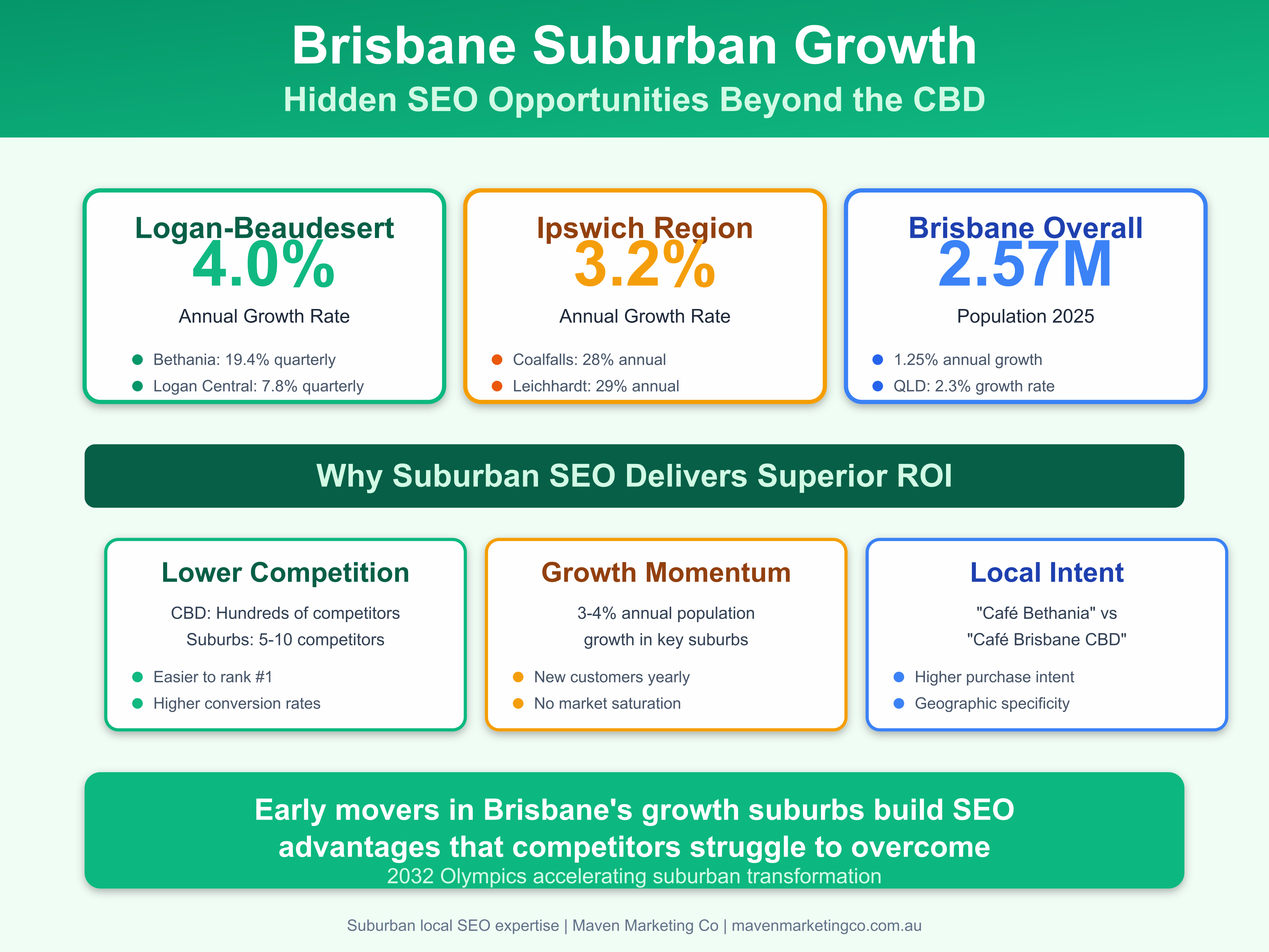 Brisbane's population reached 2.568 million in 2025, growing at 1.25% annually—significantly above Australia's national average. However, this growth isn't concentrated in the inner city. According to Queensland Government data, suburbs like Logan-Beaudesert experienced 4.0% growth rates, whilst Ipswich recorded 3.2% annual increases. These outer suburban growth corridors present exceptional local SEO opportunities that businesses can dominate before market saturation occurs.