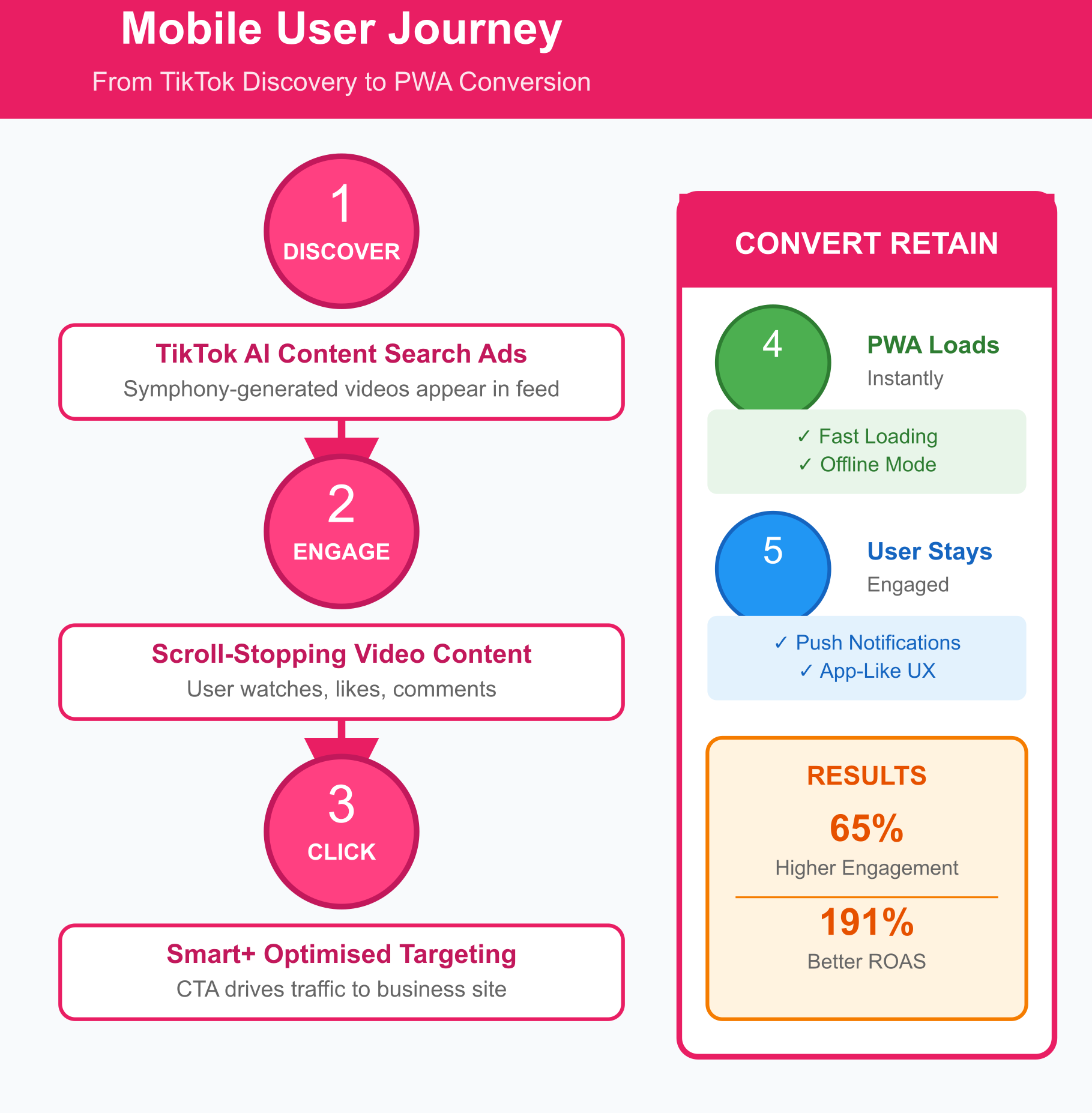 Consider this scenario: A Melbourne-based fashion retailer uses TikTok Symphony to generate multiple video variations showcasing their new collection. Smart+ automatically optimises these creatives and serves them to high-intent audiences identified through search behaviour. Users who click the ad land on a PWA that loads instantaneously, functions offline, and provides an app-like shopping experience—no download required.