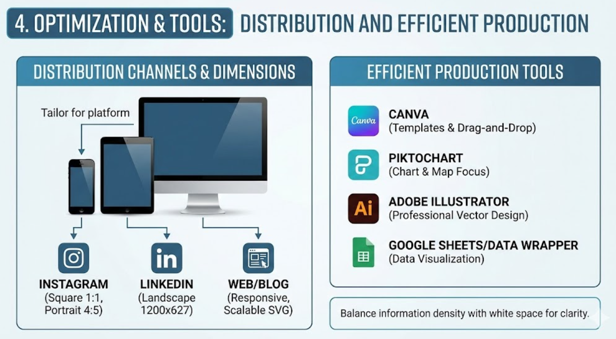 - Successful infographics balance information density with white space, avoiding clutter while providing sufficient detail, and optimize for specific distribution channels including social media dimensions, website layouts, and print applications