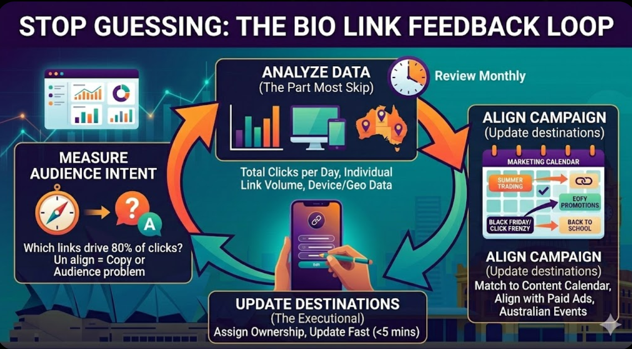 Review your bio link analytics at the same cadence as your broader Instagram analytics, which for most active Australian brand accounts means at minimum a monthly review with a check against any major content pushes or campaign periods.