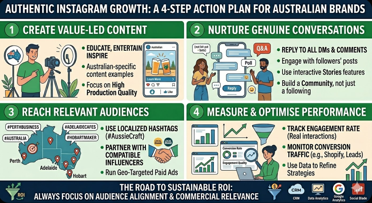 The commercial return on Instagram investment is produced by the number of genuine, interested, relevant Australian audience members the brand reaches and engages, not by the number that appears on the profile. Building that genuine audience takes longer, costs more per follower in the short term, and requires a sustained commitment to content quality and community engagement that follower purchase services do not require. But the commercial difference between an account with a healthy Australian audience and one with an inflated count of disengaged or fake followers is the difference between a channel that generates real business outcomes and one that generates reports that look impressive but carry no commercial substance behind them.