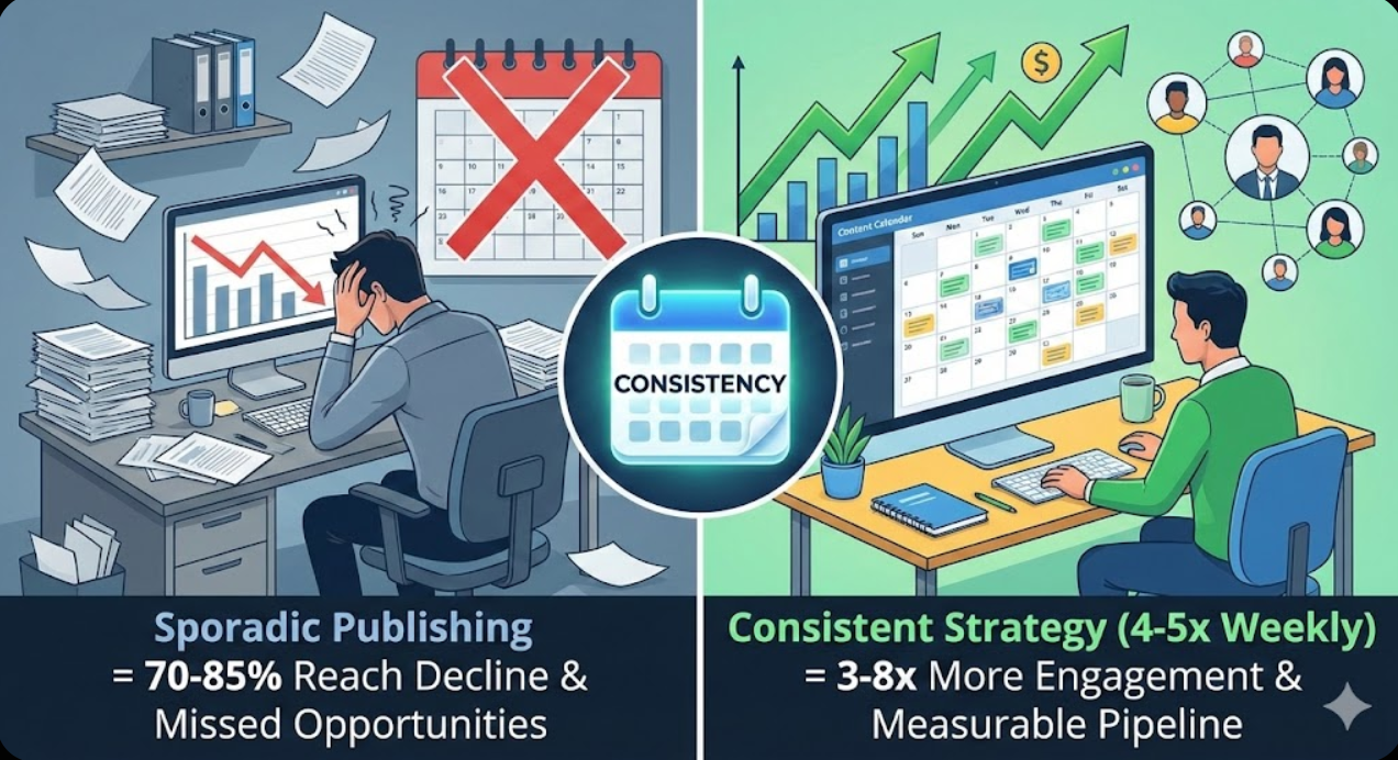 Research on LinkedIn content consistency demonstrates businesses posting 4-5 times weekly achieve 2-3x higher reach and engagement than weekly posters, with sporadic publishers (2-3 monthly) showing 60-80% lower performance due to algorithmic deprioritization and audience disengagement from unreliable sources.