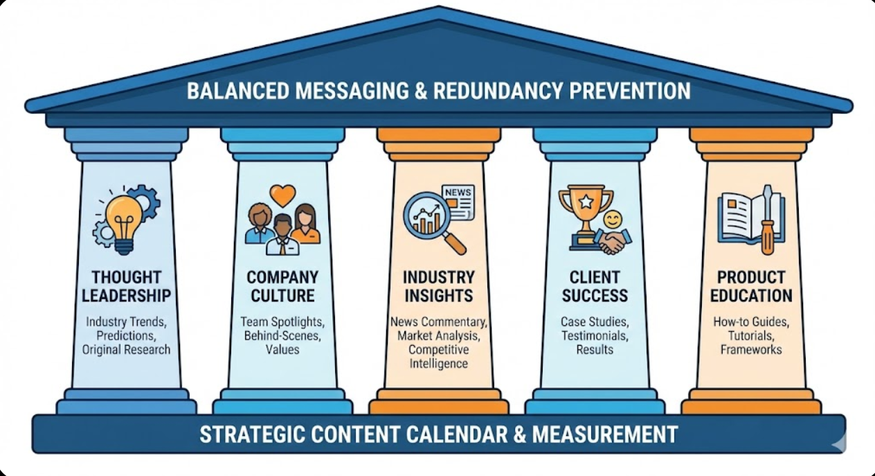 - Content pillars provide strategic structure organizing posts across 3-5 core themes (thought leadership, company culture, industry insights, client success, product education) preventing redundancy whilst ensuring balanced messaging