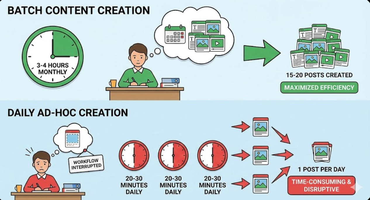- Batch content creation maximizes efficiency through dedicating 3-4 hours monthly creating 15-20 posts in single session versus daily ad-hoc creation consuming 20-30 minutes each interrupting workflows