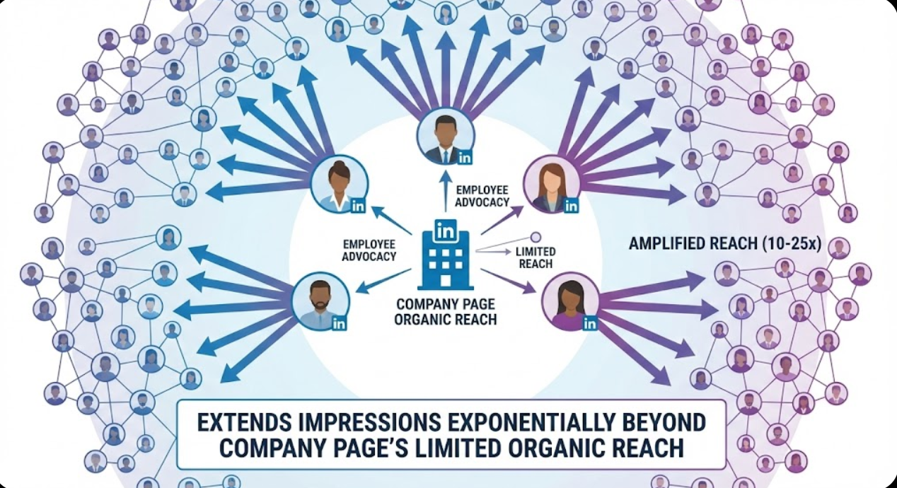 Employee advocacy amplifies company content reach through personal networks extending impressions 10-25x beyond company page's organic limitations.
