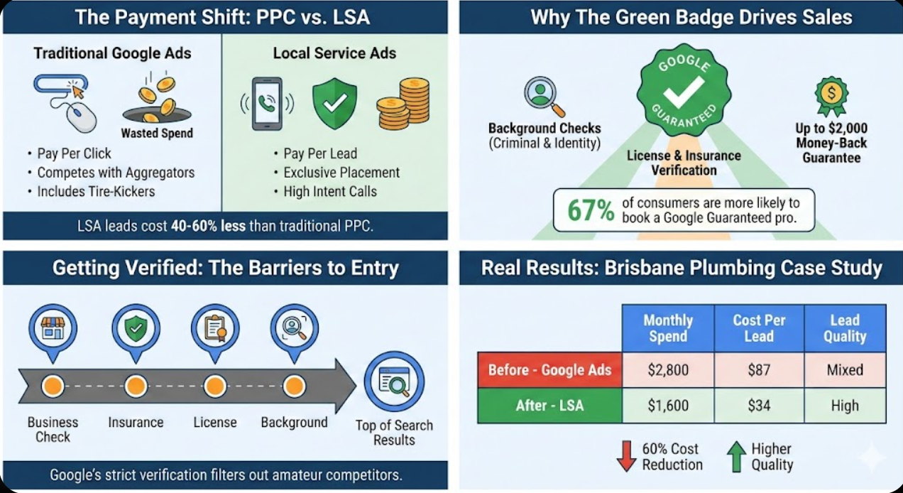 - Local Service Ads charge per lead not per click, with Australian trades paying $15-$65 per call or message compared to $8-$45 per click in traditional Google Ads where 60-80% never convert to qualified leads