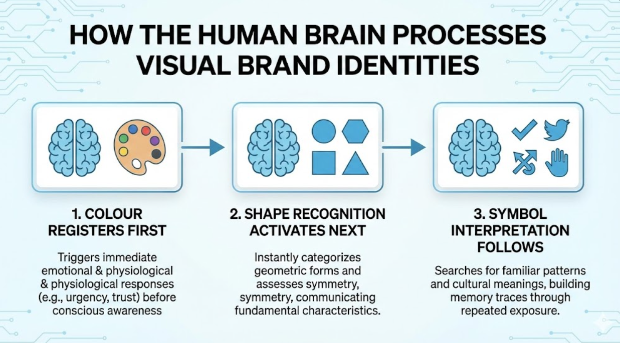 Understanding logo psychology starts with understanding visual processing. Your brain's visual cortex dedicates significant resources to pattern recognition, colour differentiation, and symbol interpretation. These systems evolved to help humans quickly identify opportunities and threats, and they still activate when you encounter brand identities.