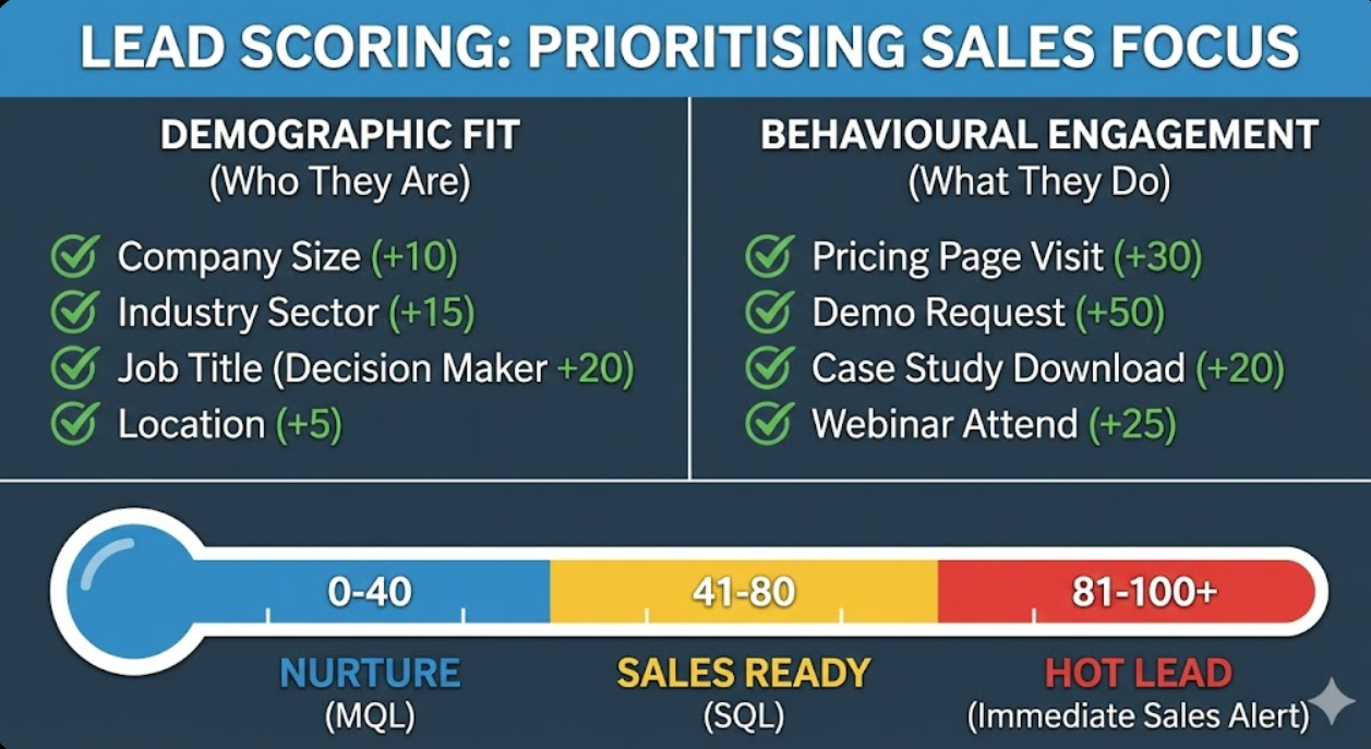 - Lead scoring frameworks prioritise follow-up attention on highest-probability conversion opportunities by combining demographic fit with behavioural engagement signals, enabling sales teams to focus effort where it generates most revenue rather than treating all leads equally
