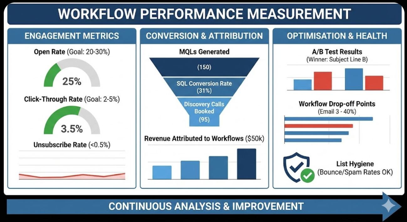 Workflow conversion metrics track progress toward commercial objectives beyond email engagement. MQL generation rate from specific workflows reveals which sequences most effectively advance leads toward sales qualification. SQL conversion rates compare workflow-nurtured leads against non-automated equivalents, validating that automation improves conversion rather than merely maintaining contact frequency. Discovery call booking rates from automation-triggered notifications measure how effectively workflows identify and present high-intent prospects to sales teams. Revenue attribution connecting specific workflows to closed revenue through CRM integration provides the most commercially compelling performance evidence justifying automation investment.