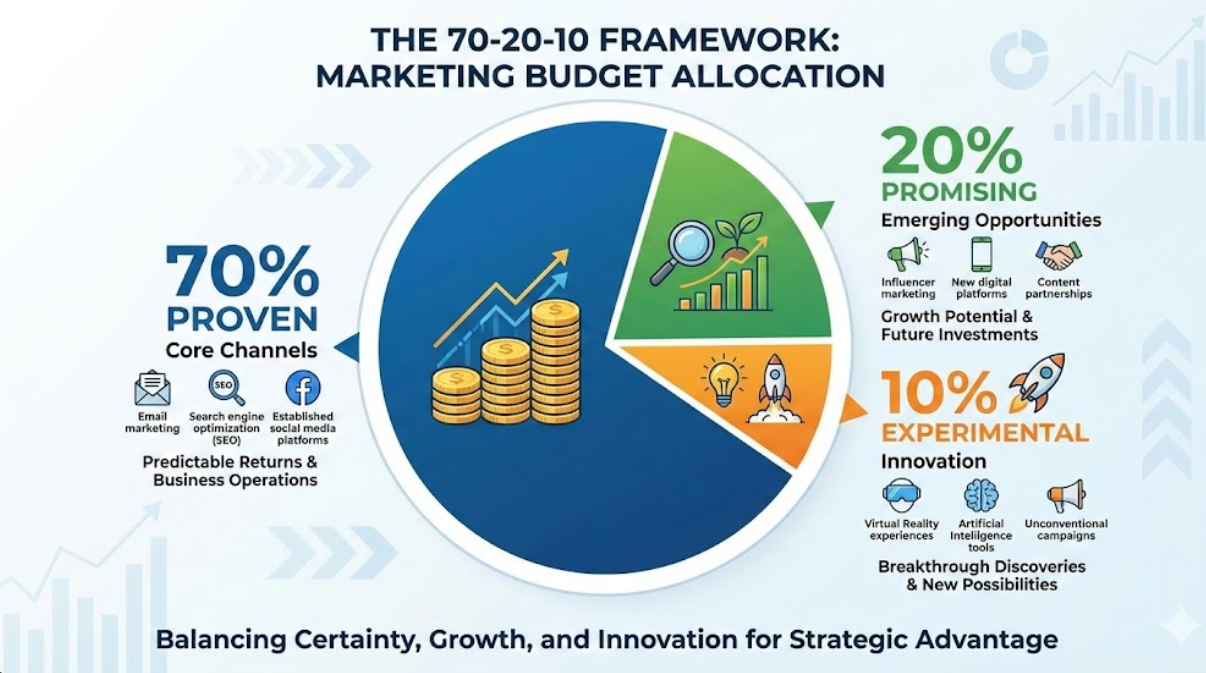 - The 70-20-10 framework provides strategic allocation structure: 70% to proven channels delivering consistent returns, 20% to emerging opportunities showing promise, and 10% to experimental tests exploring new possibilities