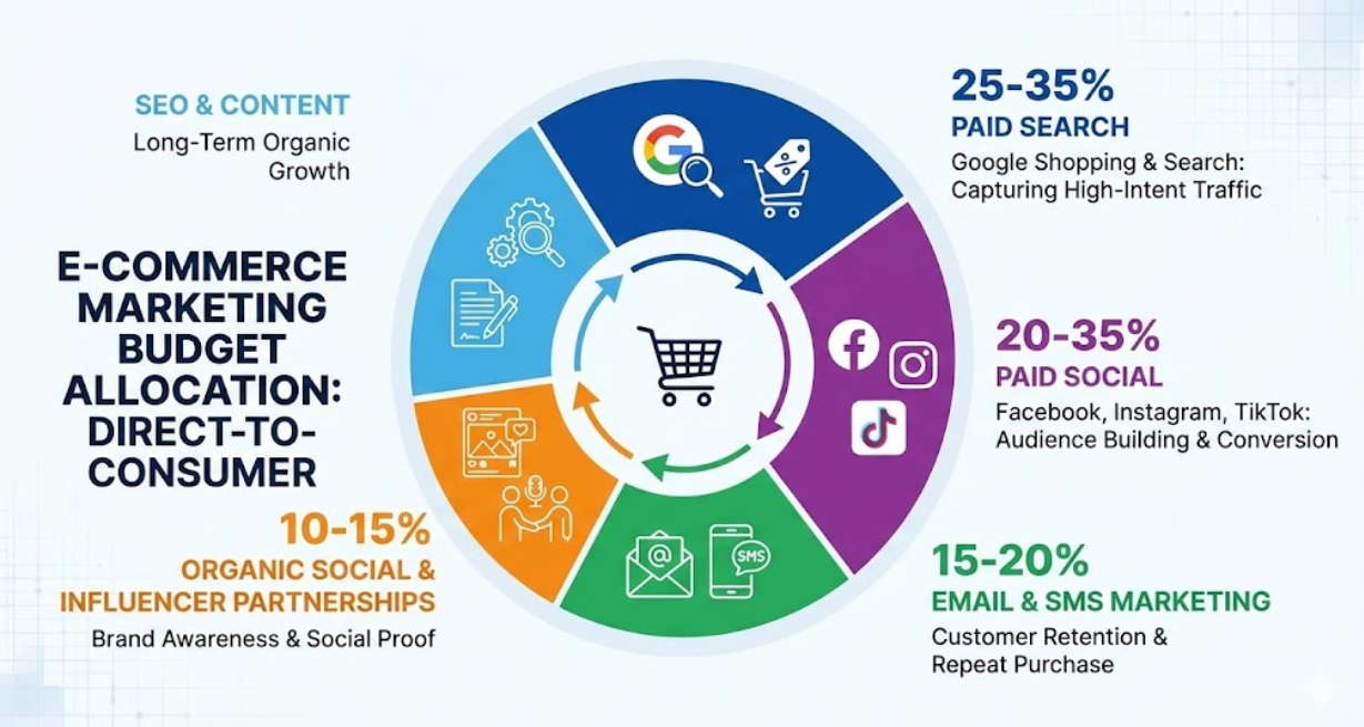 E-commerce and retail businesses selling directly to consumers benefit from paid search (Google Shopping and Search) receiving 25-35% of budget capturing high-intent traffic, paid social (Facebook, Instagram, TikTok) taking 20-35% for audience building and conversion, email and SMS marketing maintaining 15-20% for customer retention and repeat purchase, organic social and influencer partnerships capturing 10-15% for brand awareness and social proof, and SEO and content receiving 10-15% for long-term organic growth.
