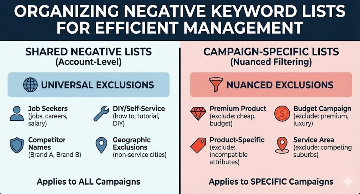 Organized negative keyword lists enable efficient management across multiple campaigns through shared exclusions and campaign-specific filters.