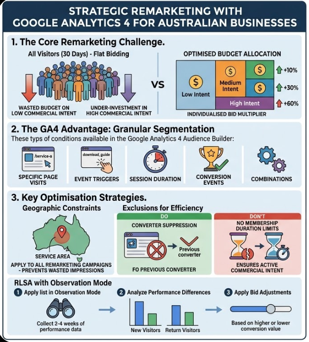 - Google Analytics 4 audience builder allows Australian businesses to create remarketing lists based on specific page visits, event triggers, session duration, conversion events, and combinations of these conditions, providing granular segmentation capability beyond what the Google Ads native audience tool offers.