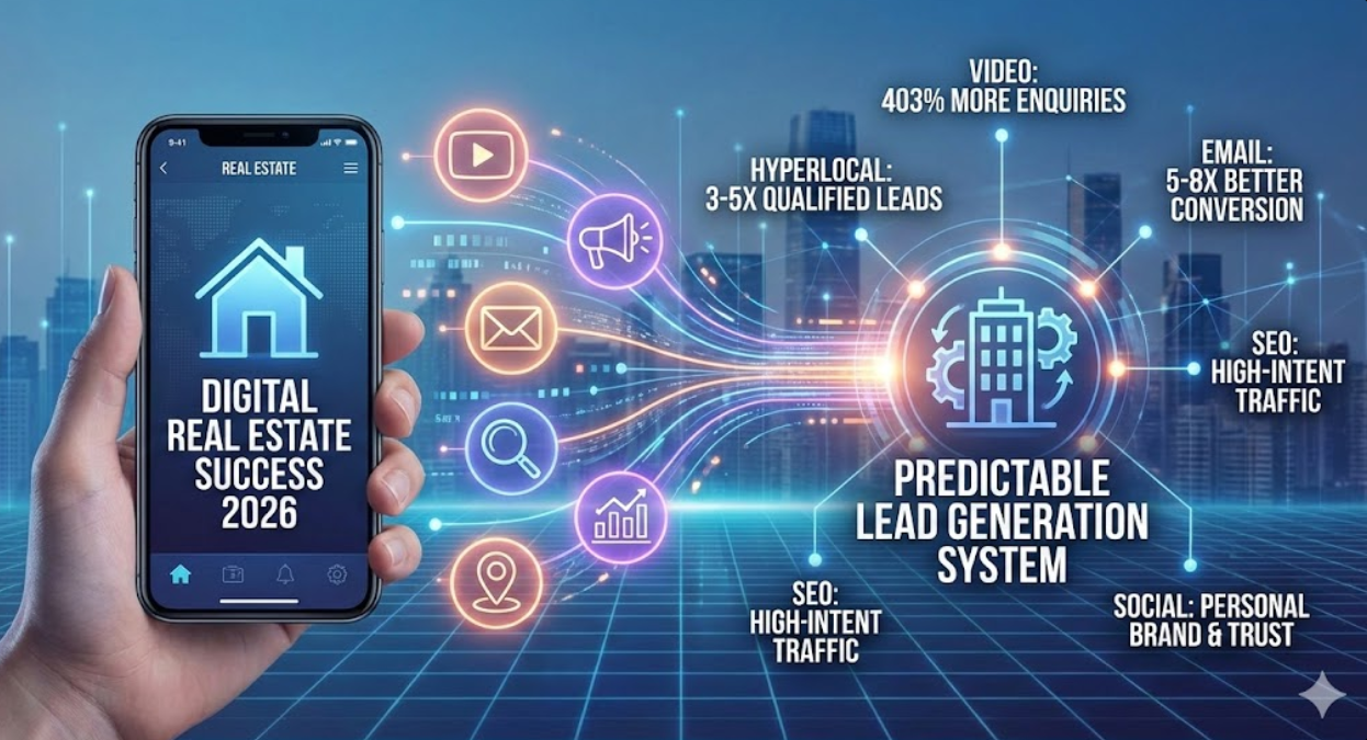 Real estate success in 2026 requires systematic digital marketing, not sporadic tactics. Agents dominating their markets attract leads through sophisticated digital strategies while competitors chase diminishing returns from traditional prospecting.