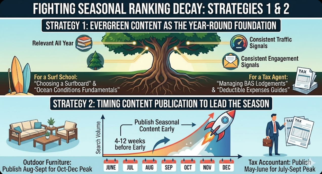 For a surf school that peaks in summer, evergreen content might include articles on how to choose a surfboard, the fundamentals of reading ocean conditions, surf etiquette for beginners, and guides to surfing locations along the relevant stretch of Australian coastline. None of these articles peak exclusively in summer. They attract traffic and generate engagement throughout the year, keeping the site's quality signals active during the autumn and winter months when the seasonal content is dormant.