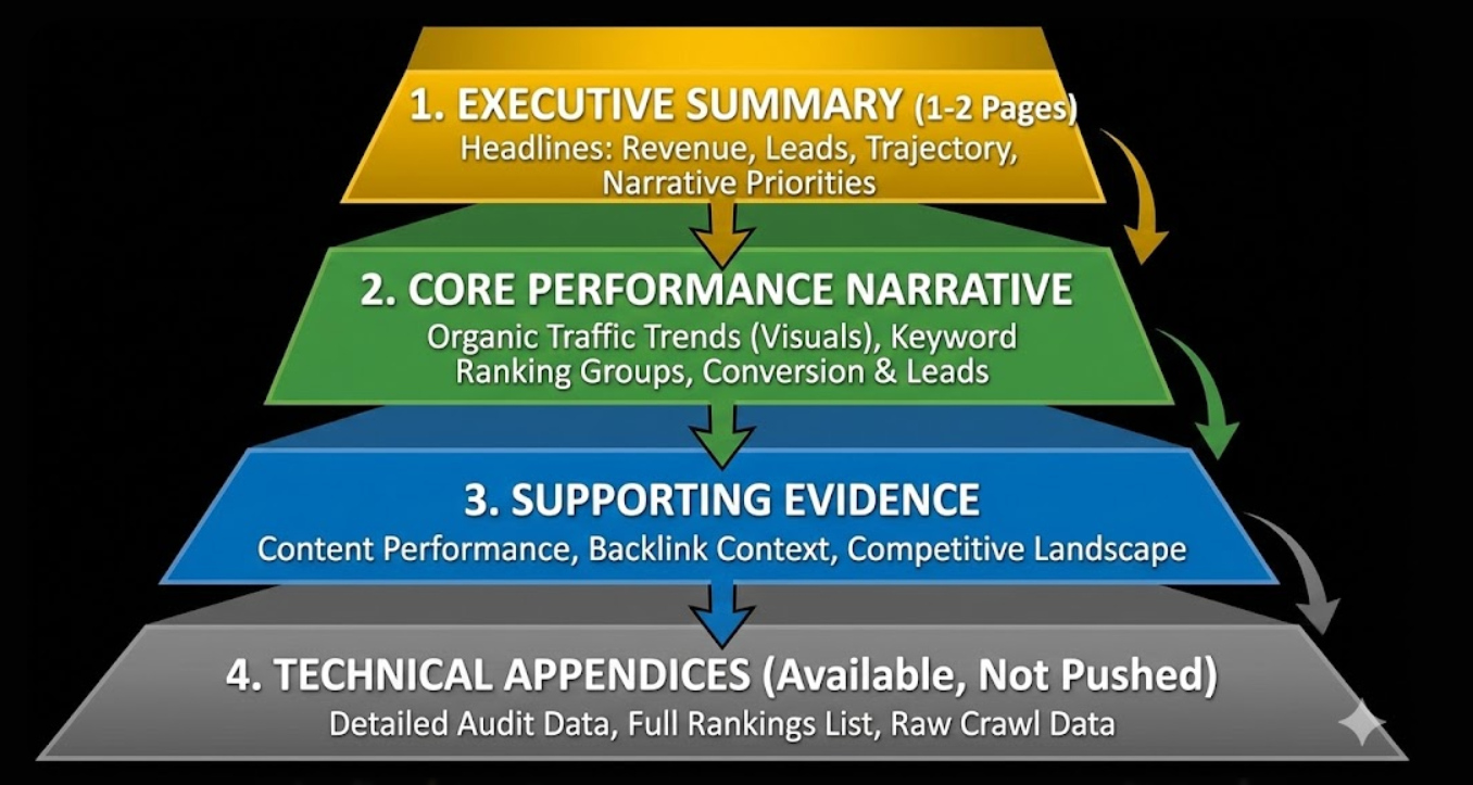 - Report structure should follow executive communication principles—headline performance summary first, supporting evidence second, and technical detail last or in appendices for clients who want it