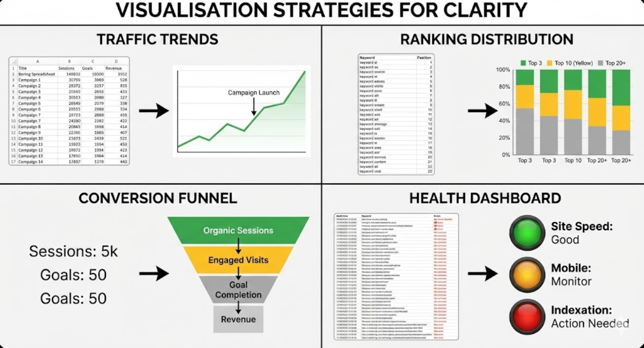 The agency rebuilt their reporting framework entirely. Reports shrank to eight pages. Executive summary led with business outcomes—leads generated from organic traffic, estimated revenue attributed to SEO, year-over-year traffic growth compared against industry benchmark. Technical detail moved to appendices available but not pushed. Visualisations replaced data tables. Narrative explained what happened, why it happened, and what would happen next.