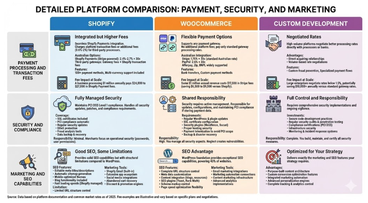 After helping hundreds of Australian businesses launch and scale online stores, we've seen every scenario play out. Let's cut through the marketing hype and examine what really matters when choosing between Shopify, WooCommerce, and custom development in 2026.